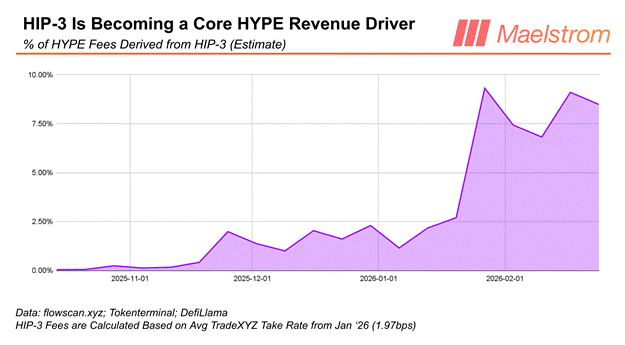 In only four months, HIP-3 volumes account for close to 10% of total Hyperliquid revenues. Permissionless listings were always the holy grail of DEXs, and the rapid growth in trading volumes proves this is how Hyperliquid will differentiate itself from the pack. To grow Hyperliquid revenues by 66% from March to August will require HIP-3 to do the heavy lifting. This is especially true if the broader crypto market cap stays at these depressed levels. Hyperliquid must give traders something new and shiny to trade on-chain. Precious metals, AI stonks, and oil are what the plebes desire to trade. And now, using perps, anyone from around the world can trade 24/7 with higher leverage than TradFi exchanges offer. For these reasons, my model assumes HIP-3 revenue will rise 160% in six months.