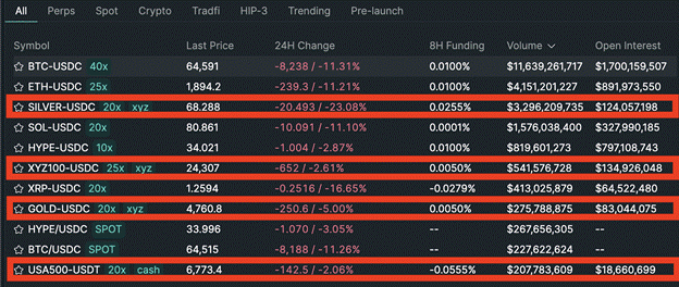 HIP-3 is the protocol that allows for permissionless listings of perps. If you stake 500,000 $HYPE tokens, you can create your own markets on whatever you like using the Hyperliquid matching and margining engine. TradeXYZ did just that, and their flagship products are perps on silver, gold, the Nasdaq 100, and the S&P 500. By the way, the silver and gold markets are less than three months old and are already trading hundreds, if not billions, of dollars per day. This is where price discovery will occur as the filthy fiat financial system changes the rules on the fly to smother the will of the people to be free of tyrannical statist money.