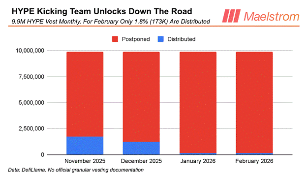 The eleven-person Hyperliquid team shipped the best DEX product ever. Riches should flow to them via their ownership of locked $HYPE tokens. When Maelstrom wrote its bearish piece on $HYPE late last year, it mentioned fear surrounding the uncertainty of the total amount of tokens the team would dump into the market each month. Because Hyperliquid took no VC funding, it is really an internal political decision between Jeff and his team whether they will voluntarily decide not to sell recently vested tokens. They limited token sales.