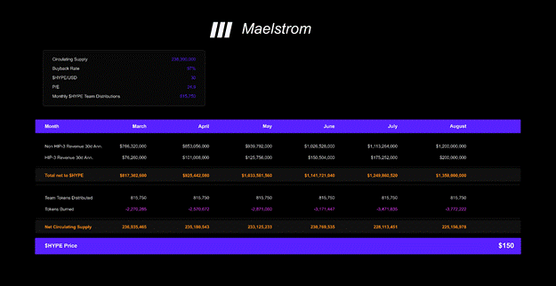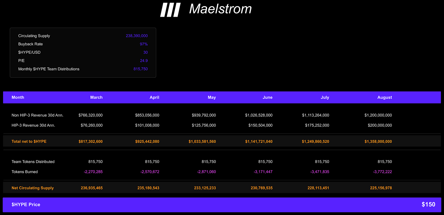 My model calls for an increase in revenues from HIP-3 and non-HIP-3 sources from a March total of $843m to an August total of $1.4bn. I will explain how Hyperliquid can regain its all-time high 30day annualized revenue run rate in the face of increased perp DEX competition. The last piece comes down to estimating how many $HYPE tokens the team will receive each month, using the past three months’ history of such transactions as a guide.