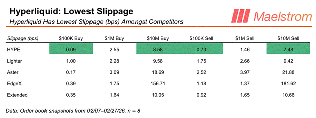 As you can see, executing size on Hyperliquid most times is the cheapest. Therefore, even if the headline taker fee is one or two basis points lower on a competing platform, real traders will still flock to Hyperliquid as they can trade in larger sizes with minimal market impact.