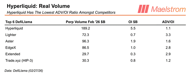 Volumizing and liquidity farming do not deepen real liquidity. Assessing with certainty the percentage of trading volume attributable to these activities is impossible. The only objective measure to rank exchanges against one another is to calculate the ADV/OI ratio.[4] Because a trader must put up actual capital to margin an open position, OI tells us the degree to which real traders use the platform. ADV is easily inflated by volumizing and liquidity farming, but by deflating it by OI we arrive at a measure of organic volume driven by risk-taking traders. Therefore, the lower the ADV/OI ratio, the better.
