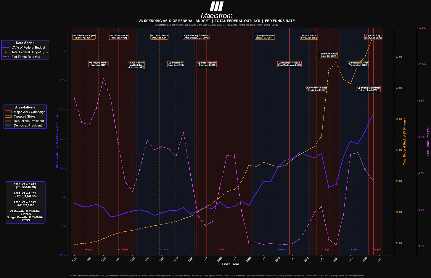 At a high level, it depicts the human cost of war, represented by the percentage of the US federal budget spent on Veterans Affairs (VA), the aggregate nominal level of federal spending, and the effective Fed Funds Rate. It is annotated with an illustrative, not exhaustive, list of US missile strikes or full-scale wars against Middle Eastern countries. As you can see, the cost to care for military personnel increased twice as fast as the federal budget, and most importantly to this essay, the Fed reduced the price of money right after a major Pax Americana initiated a Middle Eastern war of choice. As much as every US President that ruled during my lifetime tries to hoodwink the American public that their Middle East video game wars played out on evening television do not create misery for the only humans that matter in the Universe, American soldiers, the data clearly shows this obsession with military adventures in the Middle East destroys American lives in a costly manner.