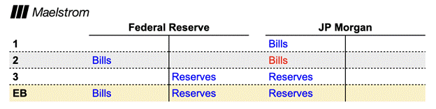 [EB]: The only difference is that the Fed exchanged reserves for bills. The QE money flow stops here because JP Morgan is less incentivized to purchase additional bills because the interest on reserves is greater than the bills yield.