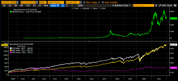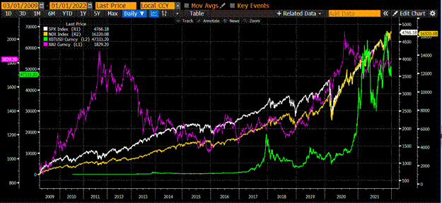 Since the post-2008 Global Financial Crisis March 2009 lows, risky assets like stonks (S&P 500 and the Nasdaq 100 indices), gold, and Bitcoin flew out of the deflationary river Styx and notched up insane returns.