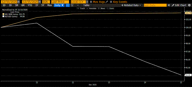 Bitcoin (white) is down 6% since the launch of RMP, while gold is up 2%.