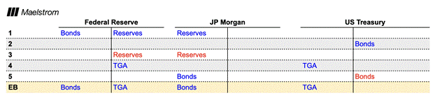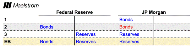 [2]: The Fed conducts a round of QE by purchasing bonds from JP Morgan.
