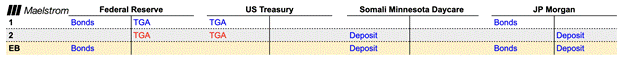 [2]: The Tim Walz Somali Daycare Center for Kids Who Can’t Read Good and Who Wanna Learn to Do Other Stuff Good Too receives a federal grant. The Treasury debts the TGA and credits the center’s JP Morgan account.