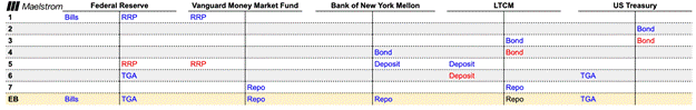 [6]: LTCM uses its deposit to pay for the bonds. The deposit becomes a TGA balance that the US Treasury holds at the Fed.