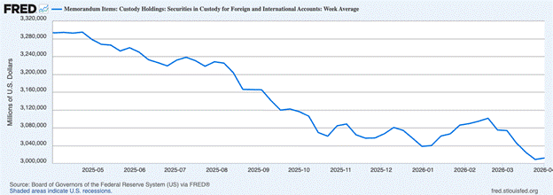 Since the war began, on a net basis, foreign securities holdings with the Fed fell $63 billion. I’m using this as a proxy for the directionality of foreign holdings of treasuries and other dollar securities like stocks.