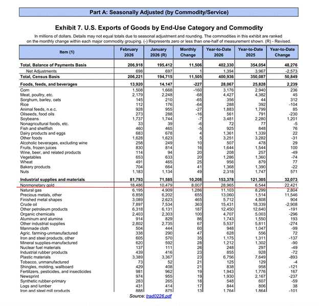 Non-monetary gold is the biggest US export for the fourth month out of the last 5 months, up 342% YoY.