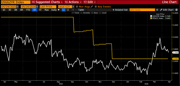 The two-year treasury bill yield (white) spiked much higher than the effective fed funds rate (gold) right after the start of the war. This showed the market believed the Fed would raise rates to counter rising energy inflation.