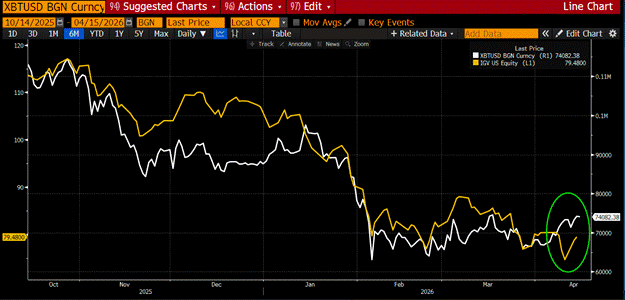 With all that being said, post the ceasefire, US SaaS software stocks resumed their down-only swoon, but Bitcoin held the line and rallied. This is a welcome break in the correlation, but for me, it is too early to declare that Bitcoin looked through the AI-related knowledge worker deflation and forecasts a big print.