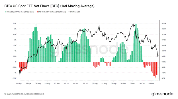 The above chart shows the annualized basis these funds harvest by buying IBIT US and selling a CME futures contract. While the exchange above is Binance, the CME annualized basis is essentially the same. When the basis is markedly above the Fed Funds rate, hedge funds will pile into the trade, creating large and persistent net inflows into the ETF. This creates the impression, to those who don’t understand the market microstructure, that there is massive interest from institutional investors for Bitcoin exposure when in reality they don’t give a fuck about Bitcoin, they only play in our sandbox for a few extra points over Fed Funds. When the basis falls, they quickly dump their positions. Recently as the basis fell, the ETF complex recorded massive net outflows. Now retail believes these same investors don’t like Bitcoin and creates a negative feedback loop that influences them to sell, which decreases the basis, finally causing more institutional investors to sell the ETF.