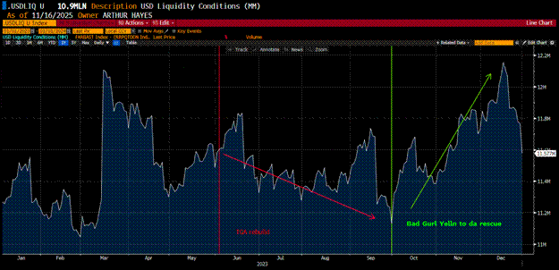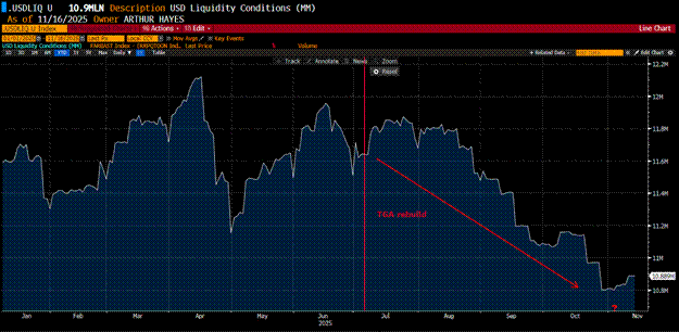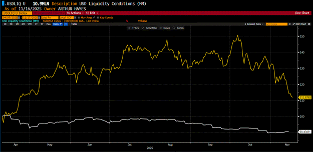 The counterargument to my negative dollar liquidity theory is that as the US government resumes operations post the shutdown, the TGA decreases by $100 to $150bn to hit the target $850bn in short order, which adds liquidity to the system. In addition, the Fed will stop shrinking its balance sheet as of December 1st, and soon resume balance sheet expansion via QE.[3]