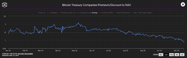 Digital Asset Treasury (DAT) companies offered another way for institutional investors to obtain Bitcoin exposure. Strategy (ticker: MSTR US) is the largest DAT that holds Bitcoin. When its stock trades at a large premium to its Bitcoin holdings, called mNAV, it allows the company to issue shares and other forms of financing to acquire Bitcoin cheaply. As the premium fell into a discount, the rate at which Strategy acquired Bitcoin decreased.