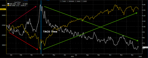 Investors face a hard choice: invest in financial or real assets. Investing in financial assets like government bonds makes sense when energy costs are low and stable. But if energy costs are high and volatile, saving in energy commodities is prudent. Therefore, at a certain price of oil, investors will demand a much higher yield on government bonds, most importantly the 10-year US Treasury note. US politicians cannot stop deficit spending because free shit always wins elections. When oil prices rise and 10-year yields reach close to 5% they must alter their behavior. Because of the insane amount of leverage embedded in the filthy fiat financial system as 10-year yields approach 5%, market volatility as measured by the MOVE Index spikes. The entire fiat system is a highly leveraged carry trade, and when volatility rises, investors must sell assets lest they lose their Savile Row tailored shirts. For example, the most recent example of the change-up was last year’s Liberation Day on April 2nd and the subsequent Trump TACO seven days later on April 9th.[3] If you remember, Trump threatened tariffs so high they would have actually reduced the global trade and financial flows imbalances, and as such they would have been very deflationary. The markets tanked, and the MOVE Index spiked to an intraday high of 172. The next day after the spike, Trump TACO’d, “paused” the tariffs, and markets bottomed then recovered violently.