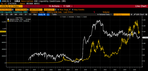 Bitcoin’s (gold) rise directly results from money printing as evidenced by my USD Liquidity Conditions Index (.USDLIQ U Index on Bloomie).