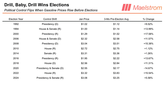 [2] The prompt to Gemini AI: looking at election results (house, senate, and presidential) in the US from 1990 to 2024, tell me what the national average price of gasoline was three months preceding any change in control from the incumbent party to the opposition party.